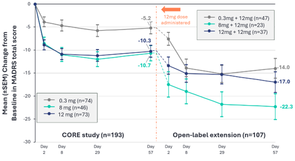 - Mean reduction in MADRS score of 14.0 points at Day 57 in the OLE compared to their baseline at the start of the core study, in line with the antidepressant effects seen in patients who received a single active dose in the core study.